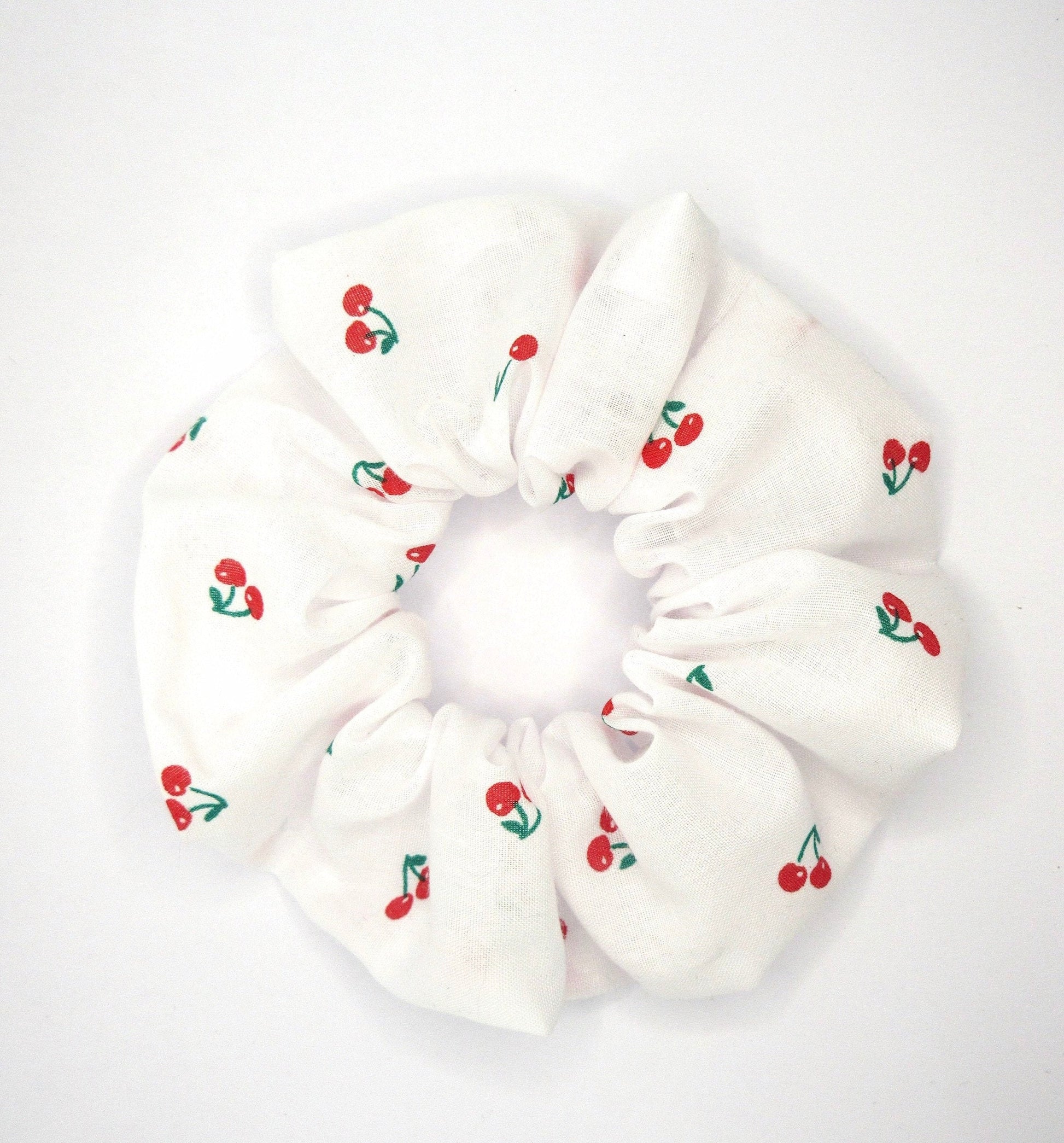 Handmade red and white cherry print scrunchie.